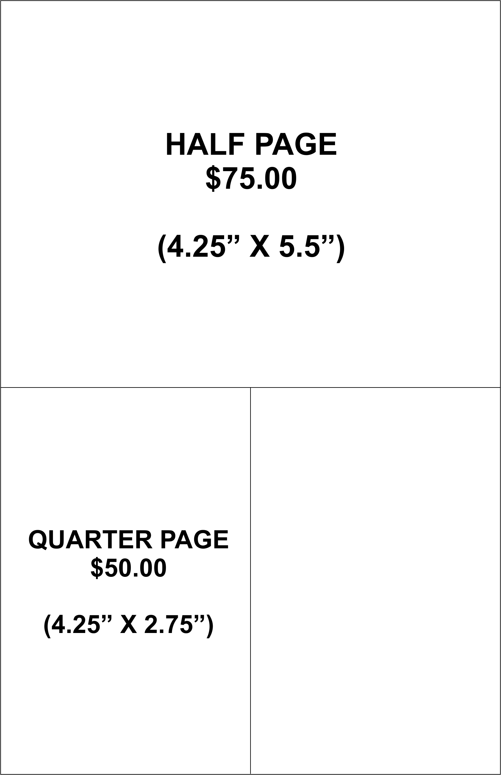 FULL PAGE - $100.00 / HALF PAGE - $75.00 / QUARTER PAGE - $50.00